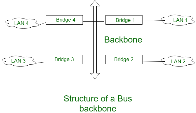 - Bus topology – Nodes connect to a central cable called a bus or backbone. Limited scalability.
