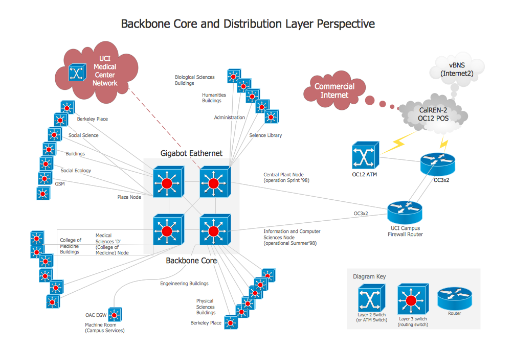 Ans: Subnets connect to backbone distribution layer switches which aggregate flows into high-speed trunk uplinks to the backbone core routers.